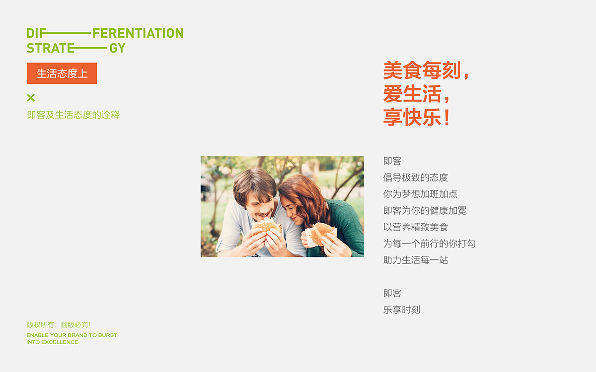 即客,樂(lè )享時(shí)刻。我們定義并通過(guò)視覺(jué)化表現來(lái)詮釋“樂(lè )享”主張。簡(jiǎn)約、流動(dòng)、張力的視覺(jué)符合結合品牌理念和產(chǎn)品賣(mài)點(diǎn)貫穿始終,塑造出一個(gè)年輕并賦予消費者健康快樂(lè )的品牌體驗。
